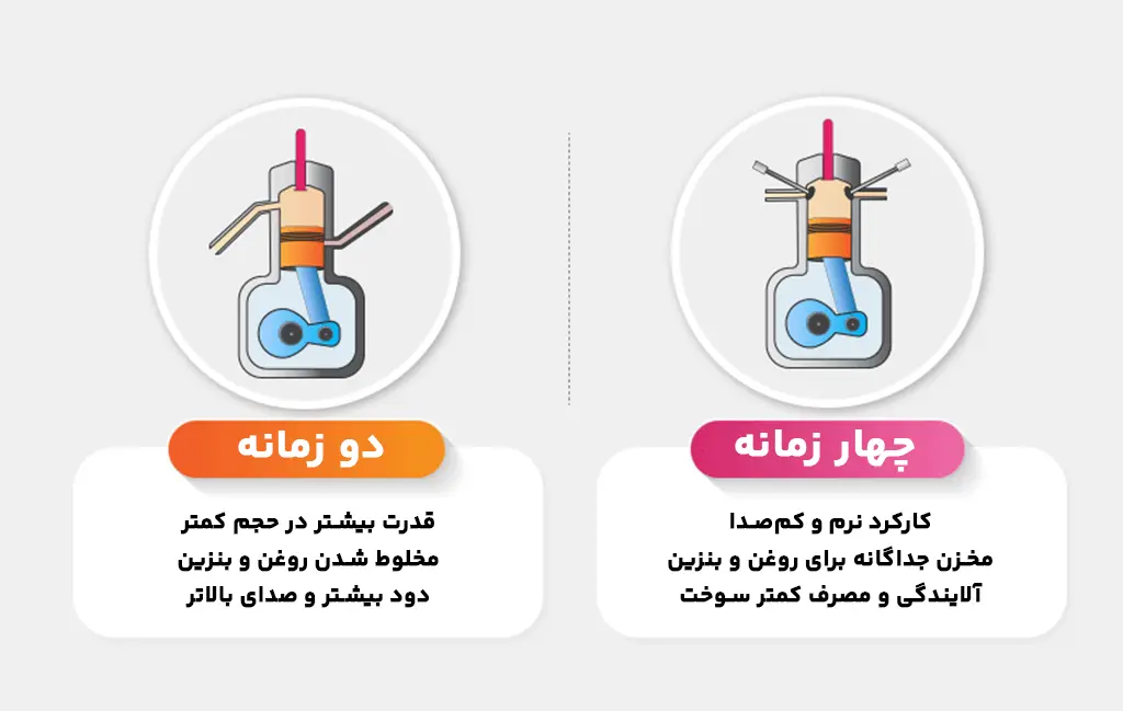 💡 نکته: به دلیل احتراق ناقص و سوزاندن روغن، این موتورها معمولاً دود قابل مشاهده دارند و صدای بالاتری تولید میکنند.